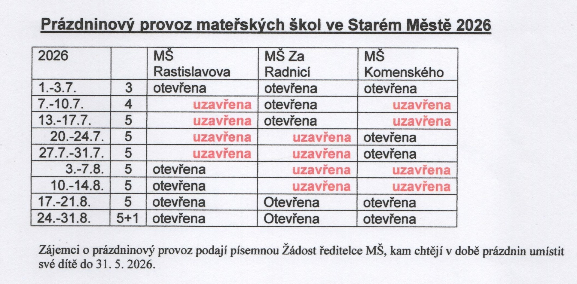 Prázdninový provoz mateřských škol ve Starém Městě pro rok 2026