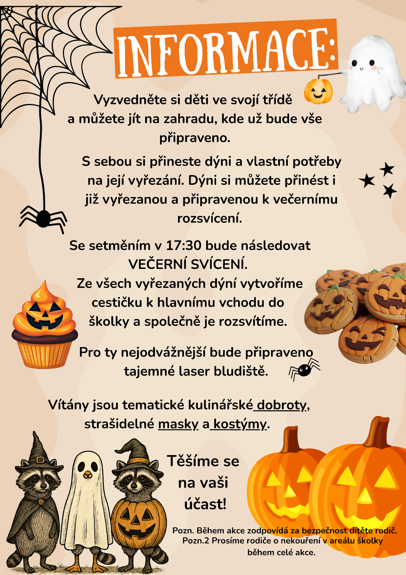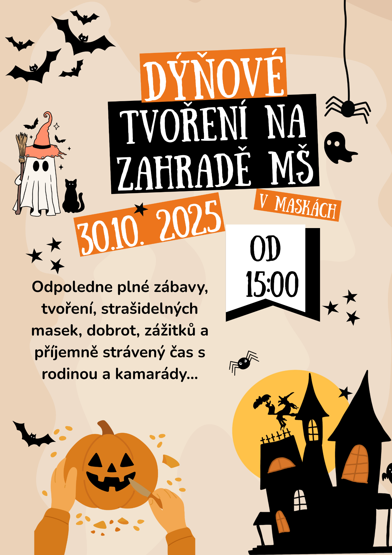 zapište si do kalendáře naši nejoblíbenější podzimní akci – Dýňové tvoření s rodiči, které se uskuteční na zahradě naší mateřské školy. Těšit se můžete na společné vydlabávání dýní, laserové bludiště, strašidelnou atmosféru, ale i na výborné dobroty a zábavu v tematických kostýmech.