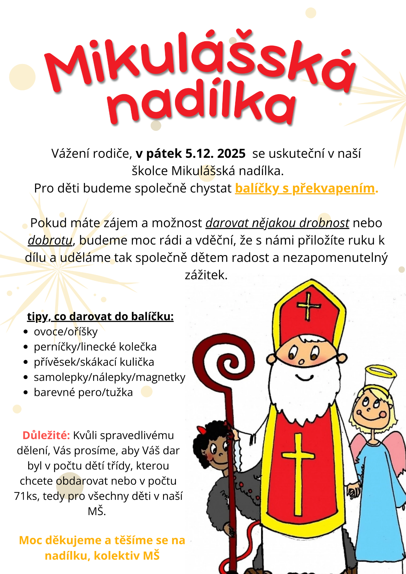 Vážení rodiče, v pátek 5.12.2025 se uskuteční v naší školce MIKULÁŠSKÁ NADÍLKA. Pro děti budeme společně chystat balíčky s překvapením.